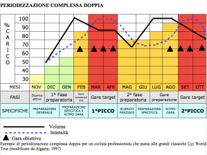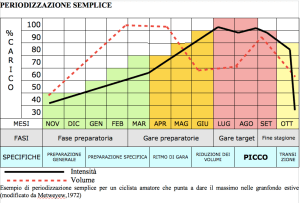 La periodizzazione stabilisce quindi l’alternarsi delle varie fasi di carico di volume-scarico di volume, aumento delle intensità, gare preparatorie.